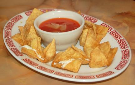 Hand-wrapped wontons filled with cream cheese and ersatz crab meat, deep-fried until golden and crisp, served with a side of savory sweet and sour dipping sauce.